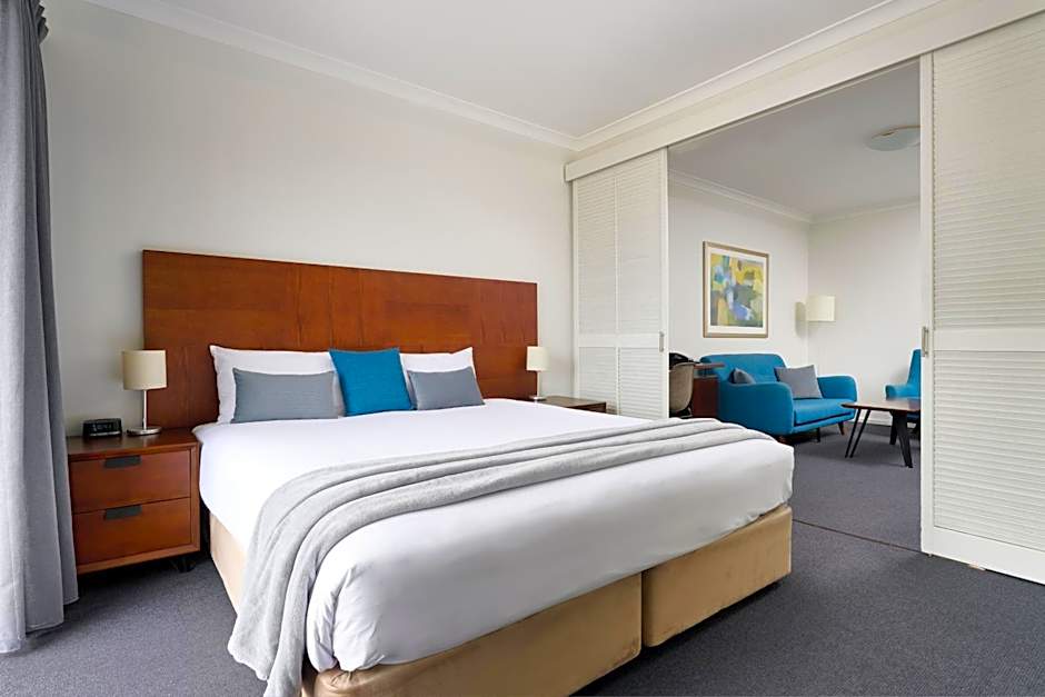This 1-bedroom executive apartment has full kitchen and laundry facilities and a personal study are. There is 1 king-size bed.